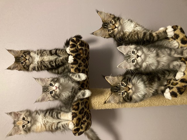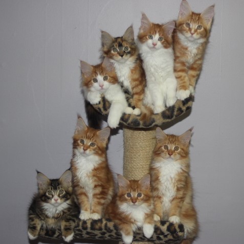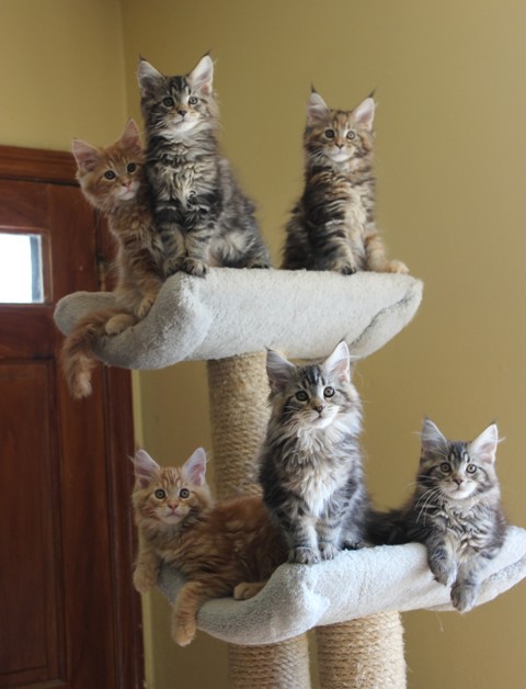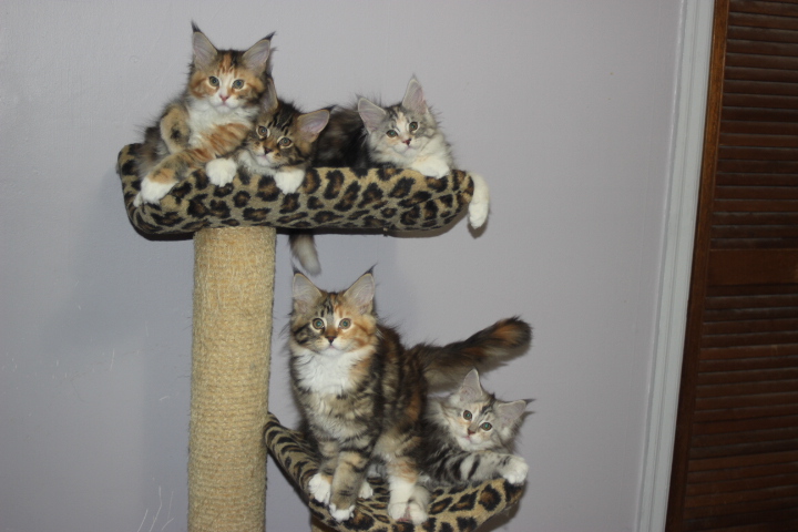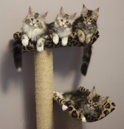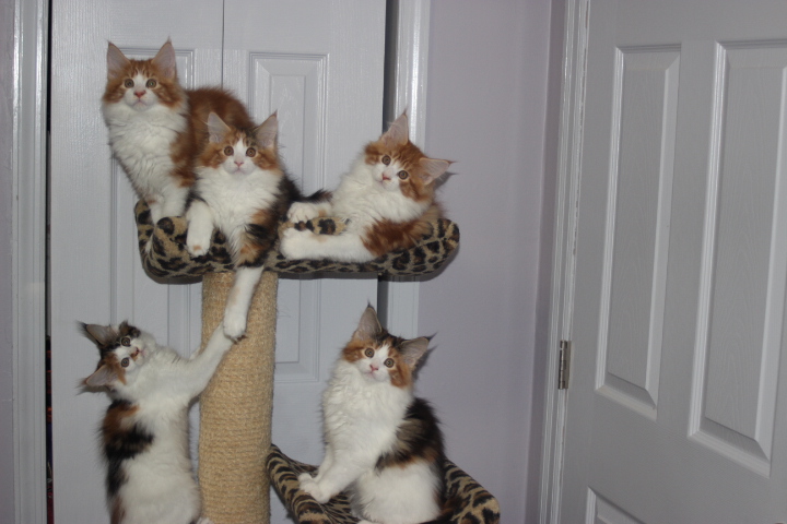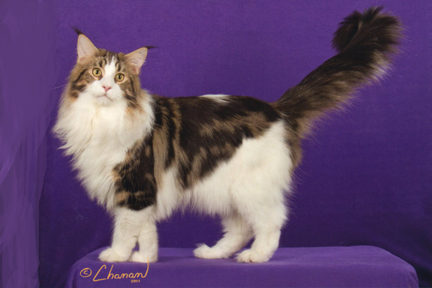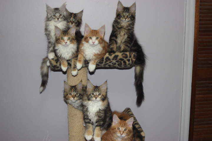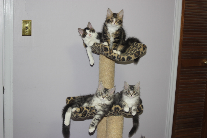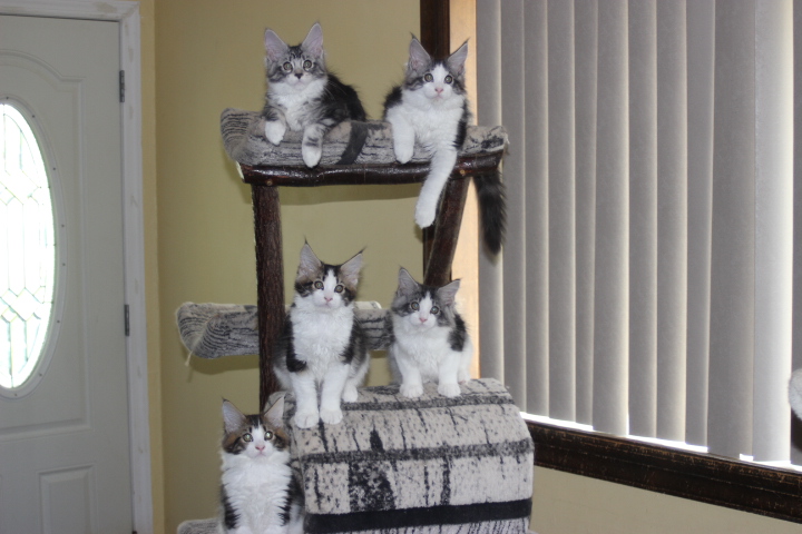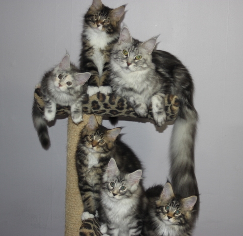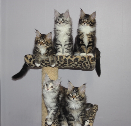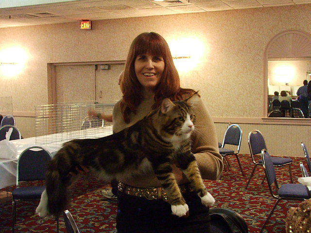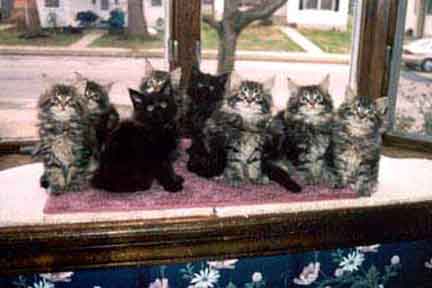 We specialize in brown classic tabbies with and without white, and both hi and low whites. We also get brown patched tabbies with & w/o white, red tabbies with and w/o white, silver tabbies with & w/o white as well as black & white. Our cattery is our home. None of our kittens are ever caged. All of our babies are given lots of love and attention and are handled on a daily basis. We breed our cats to have good health, size, temperarment and lots and lots of personality. Our kittens are well socialized when it comes time to leave us.
